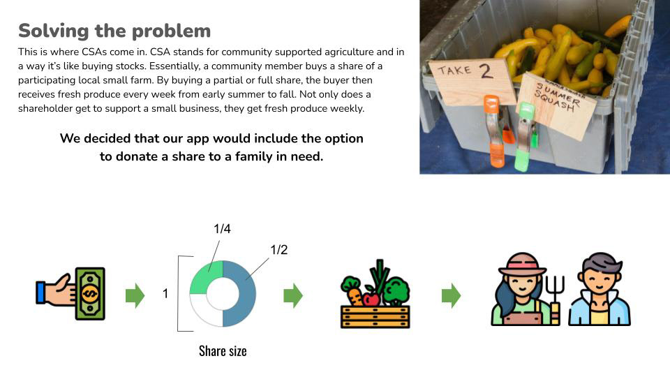 Creating an app for a local farm looking to create an easy way for people to donate CSA shares to families dealing with food insecurity.