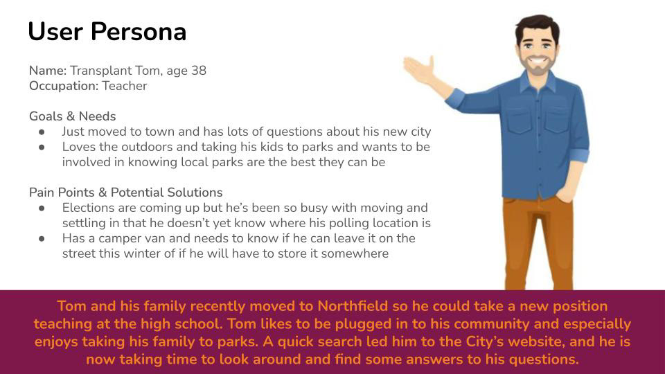 This scenario focused on a new resident wanting to learn some basic but important things about the city he and his family now call home.